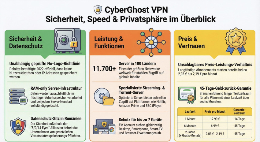 CyberGhost ist ein hervorragender VPN-Dienst für Einsteiger. Die Bedienung erfordert kein technisches Vorwissen von dir. Der Schutz deiner Daten ist jederzeit absolut verlässlich. Besonders beim Streaming funktioniert der Dienst sehr gut. Der Preis für lange Verträge ist unschlagbar günstig. Mit der langen Garantie gehst du kein Risiko ein. Du kannst das VPN in Ruhe zu Hause testen. Wir empfehlen diesen Dienst für Nutzer in Deutschland. Er bietet viel Sicherheit für eine kleine monatliche Gebühr. Dein Internet wird mit CyberGhost privat und sicher. Es ist eine sehr gute Investition in deine Privatsphäre.